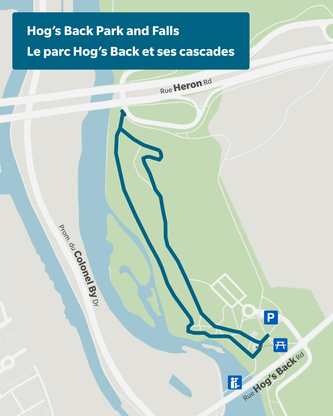 On trouve du stationnement gratuit, un service de restauration (Grill et bistro au parc Hog's Back) et des toilettes le long de l’itinéraire.