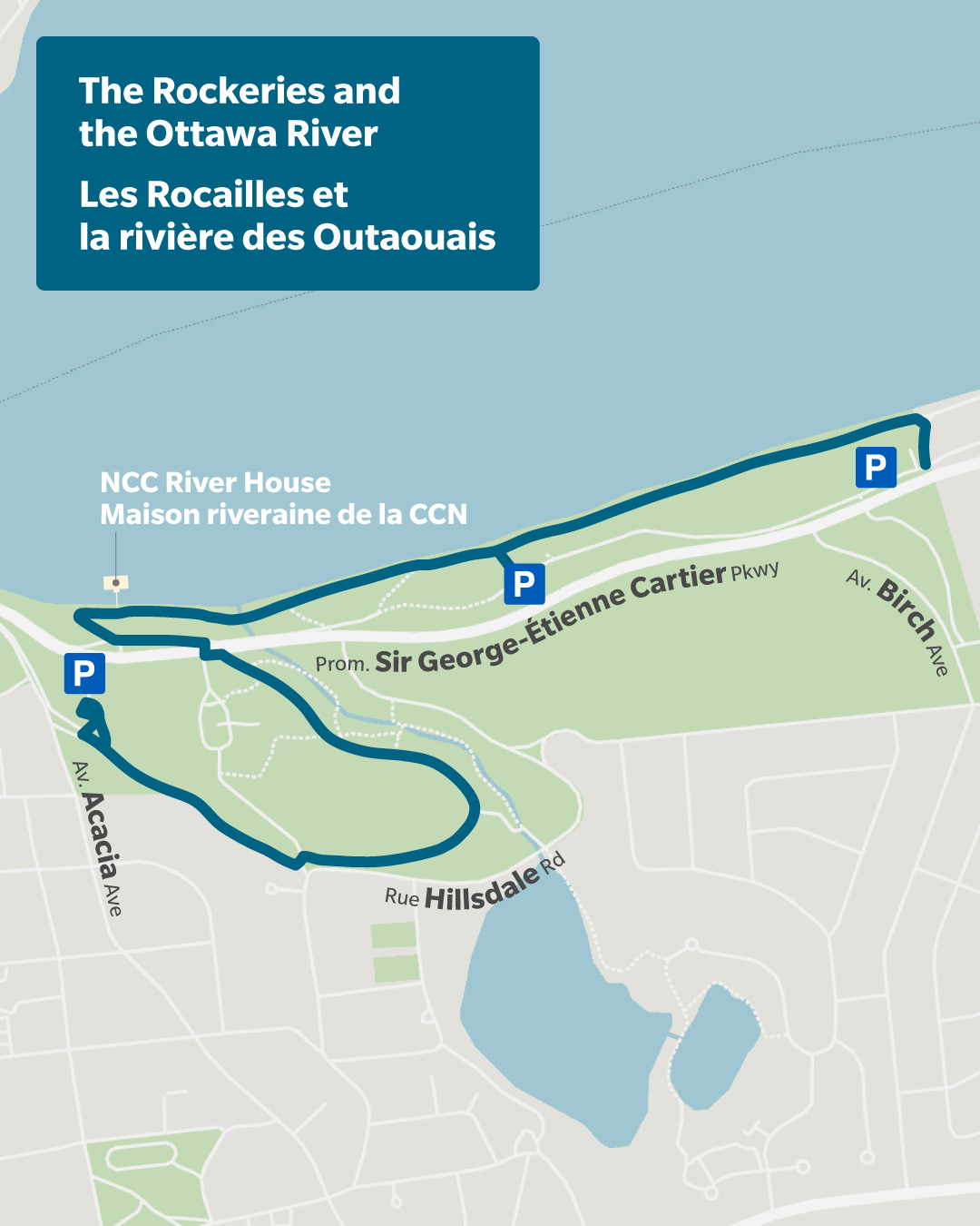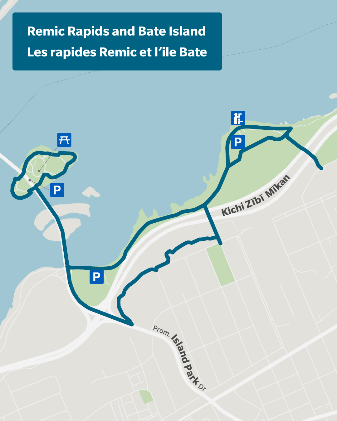 On trouve du stationnement gratuit, des services de restauration (le bistro CCN et la Taverne sur l’île) et des toilettes le long de l’itinéraire.